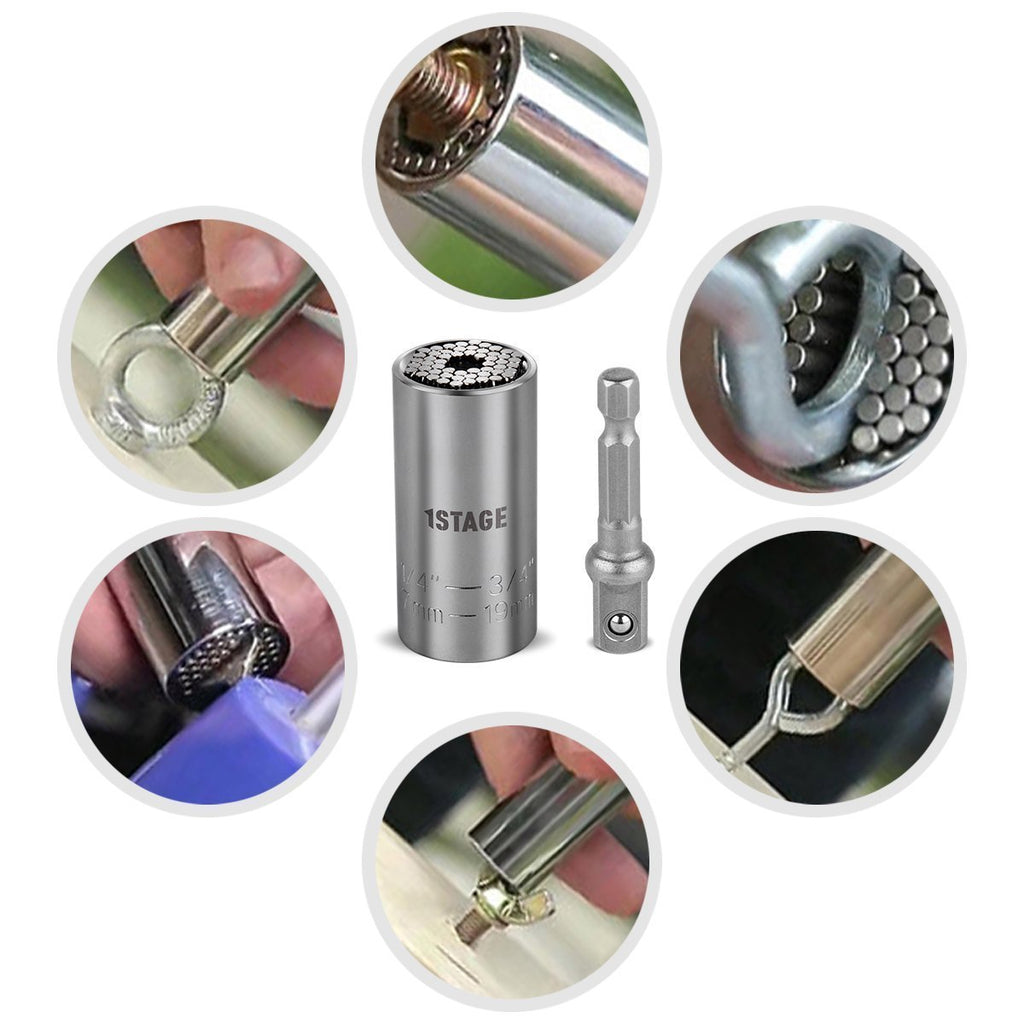 - Self-Adjusting Universal Socket: The universal socket wrench set is designed to self-adjust to any size or shape, from 1/4” to 3/4” standard and 7mm to 19mm metric, unscrew most bolts, nuts, hooks and odd shape fasteners that you don’t have the right tool for
